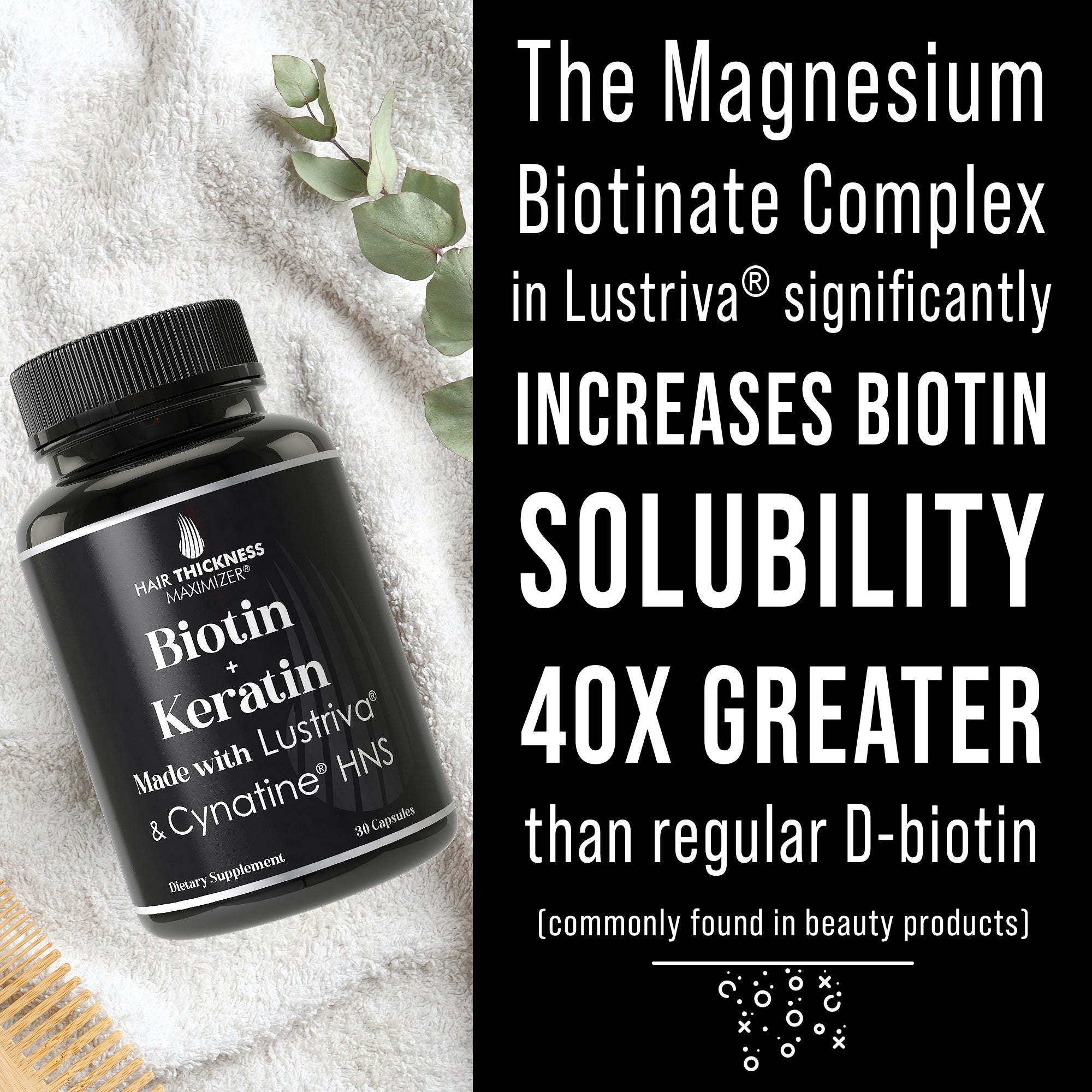 2-in-1 Clinically Proven Ingredients - Lustriva & Cynatine HNS, two ingredients shown in studies to improve hair thickness, boost biotin absorption up to 40x, enhance skin smoothness, and deliver bioavailable keratin for stronger hair, skin & nails.